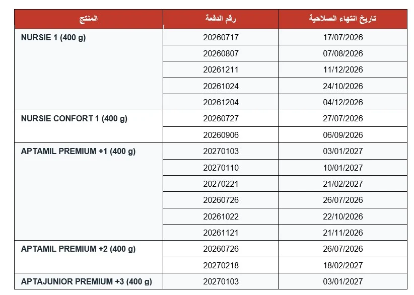 وأوصى المكتب الوطني للسلامة الصحية للمنتجات الغذائية بتجنب استعمال حليب الرضع المنتمي إلى الدفعات المشار إليها في الجدولين، وذلك كإجراء احترازي.
