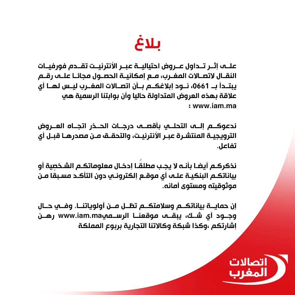وأوضحت الشركة في بلاغ رسمي أن اتصالات المغرب لا علاقة لها بهذه العروض، وأن بوابتها الرسمية هي: www.iam.ma�.